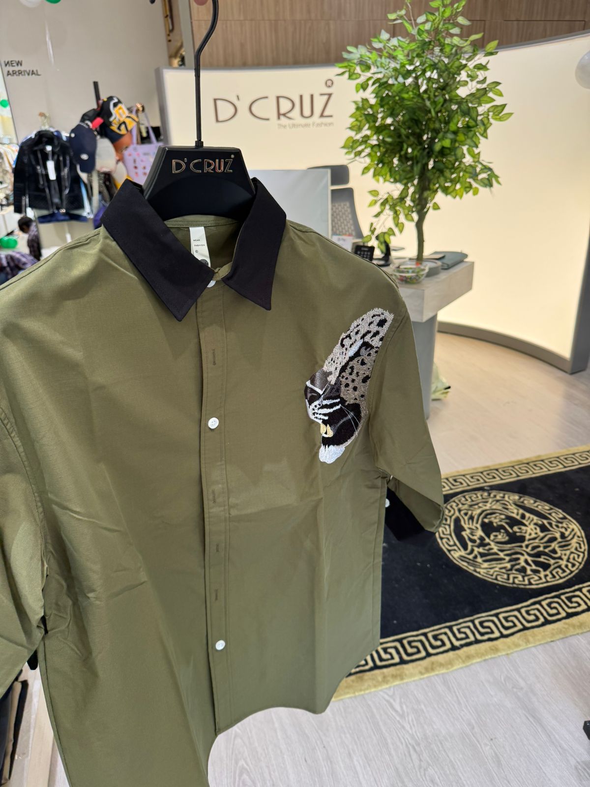 Command attention with the D’CRUZ Contrast Collar Tiger Embroidered Shirt, a bold mix of sophistication and edge. Featuring an olive-green base with a striking black contrast collar and cuffs, this long-sleeve button-down shirt is highlighted by an intricate embroidered tiger motif on the chest. The combination of minimal structure and fierce detailing makes it perfect for standout casual or semi-formal looks.