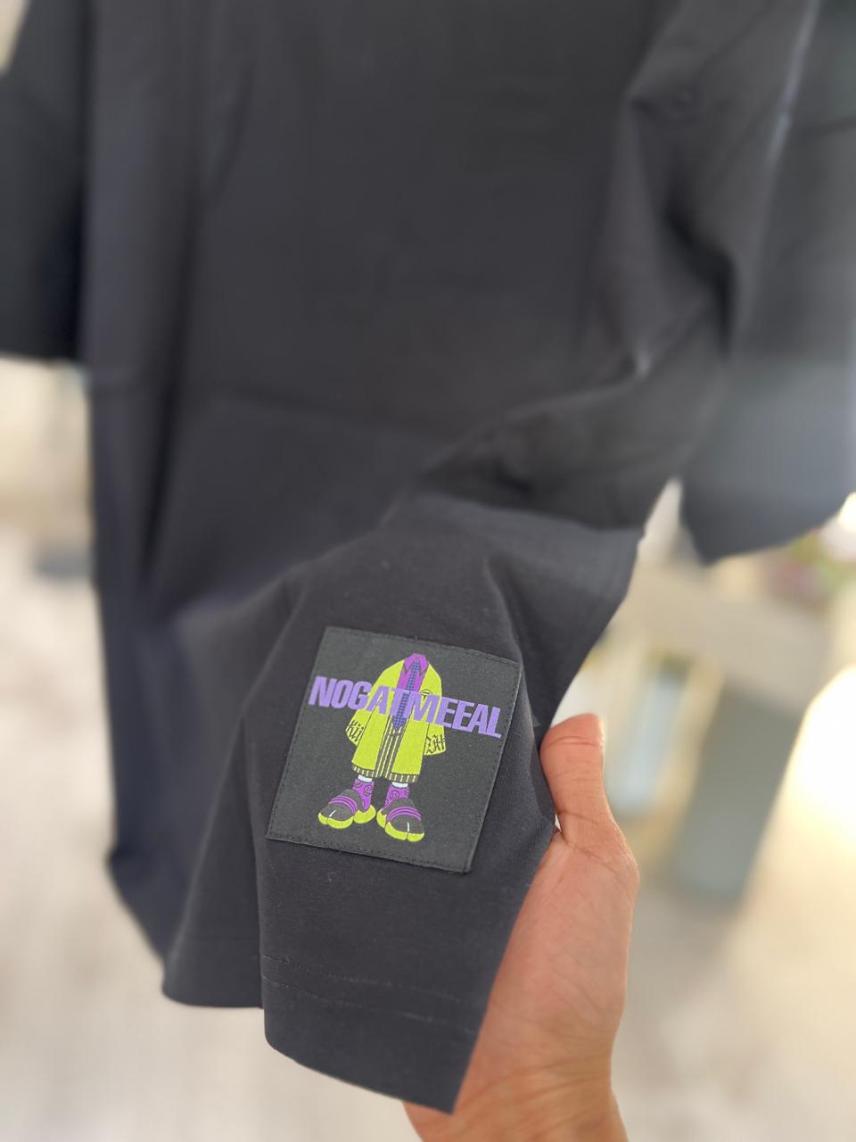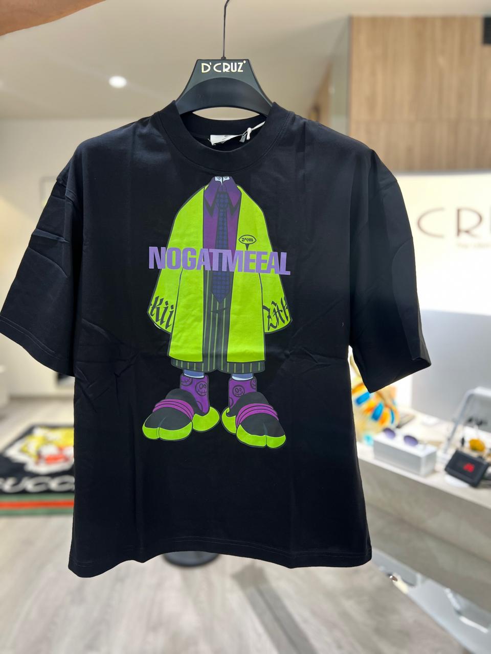 Add playful energy to your streetwear lineup with the “NOGATMEEAL” Graphic Down Shoulder T-Shirt. Featuring a bold, cartoon-style character illustration at the center, this tee combines vivid colors like neon green and deep purple for a striking visual impact. The exaggerated proportions and stylized lettering lend an anime-meets-streetwear vibe, making this piece a conversation starter.