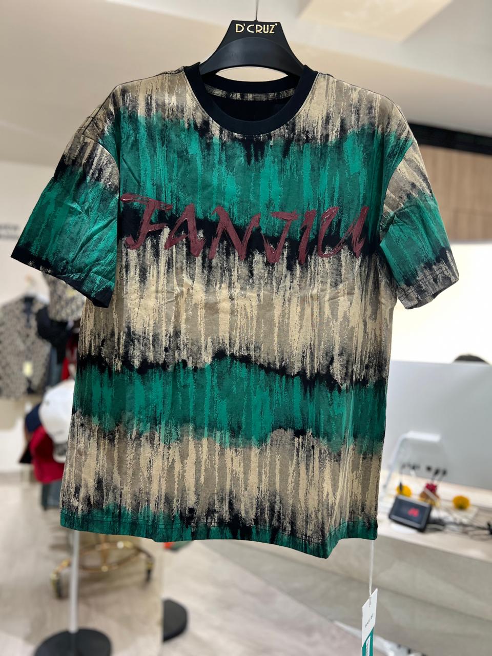 Vivid and unapologetically bold, the Green Fanjin Down Shoulder T-Shirt brings streetwear to life with its eye-catching emerald, sand, and black bleach-wash pattern. The artistic, paint-stroke aesthetic gives this piece a raw, rebellious energy, while the oversized silhouette with down shoulders keeps it effortlessly comfortable.
